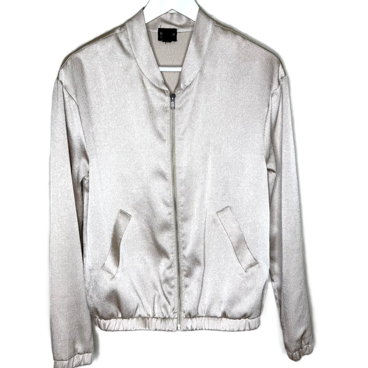 Meet the Free Press Women's Rose Gold Lightweight Textured Satin Bomber Jacket, a metallic-toned essential sized XS for a sleek, modern silhouette. The soft rosy gold satin gets a tactile texture for depth and shimmer that elevates any outfit.