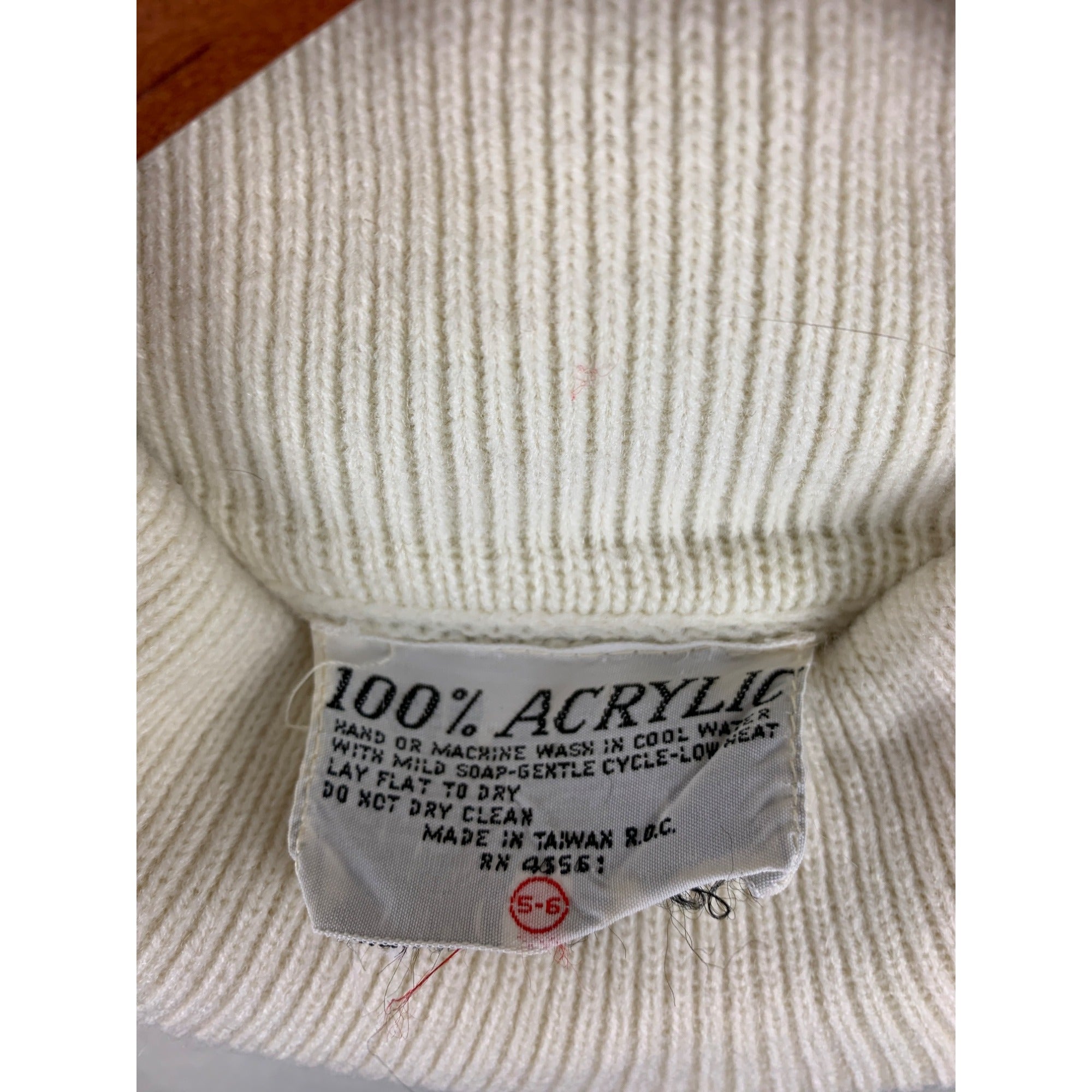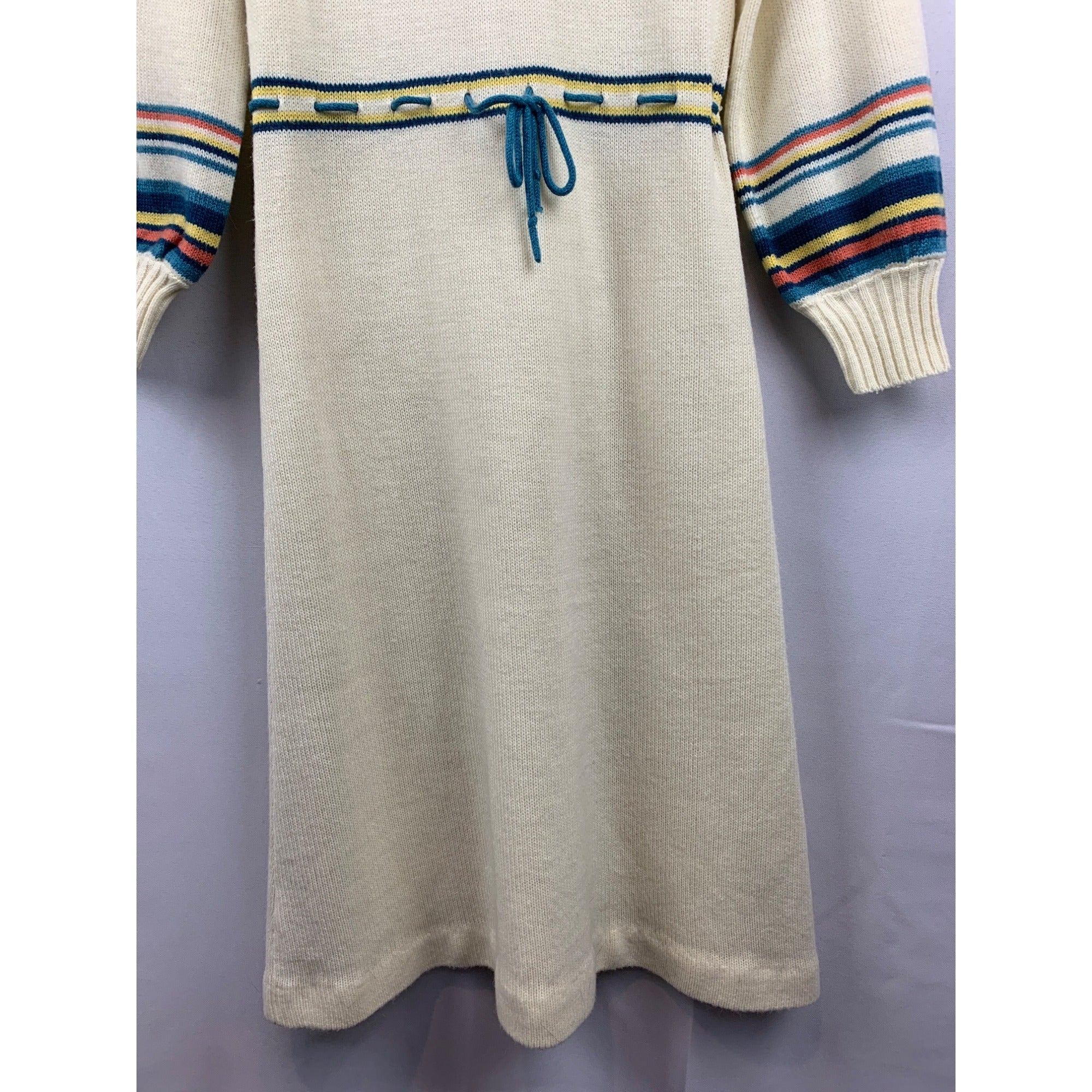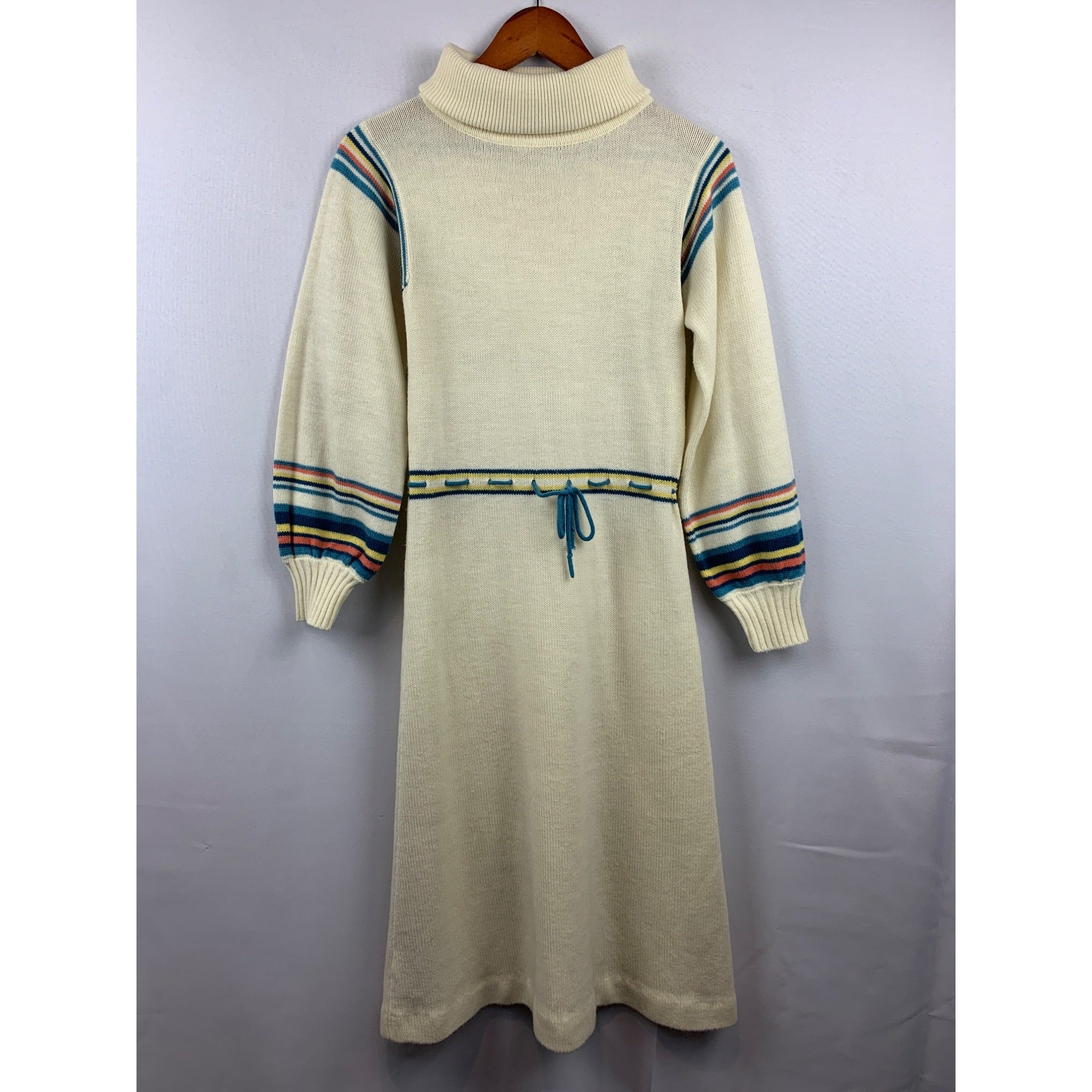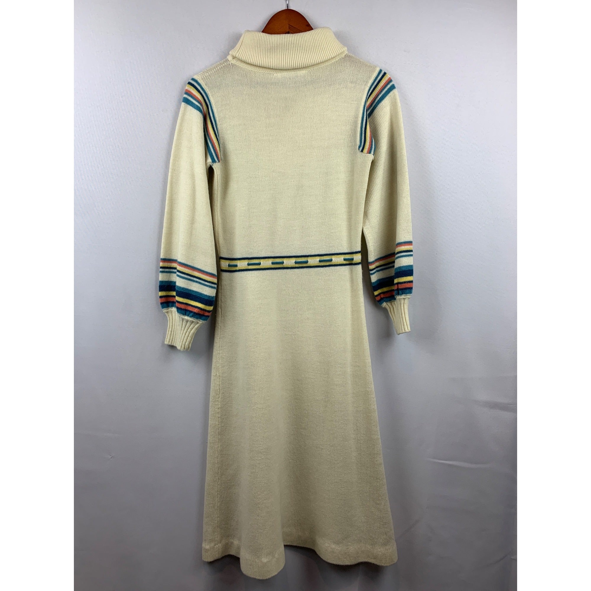 Vintage Cream Knit Dress With Striped Sleeves & Turtleneck