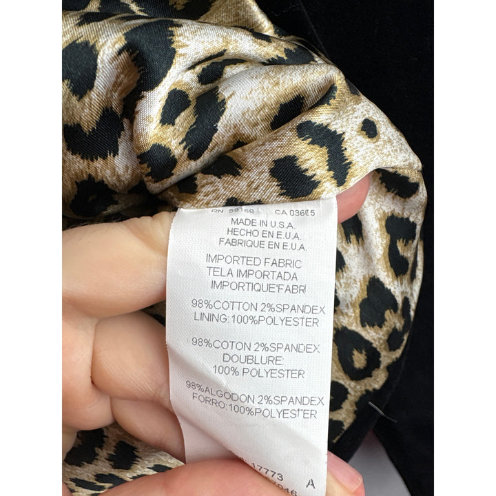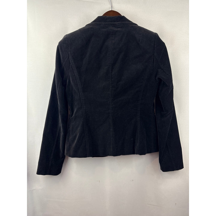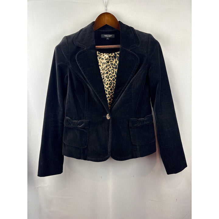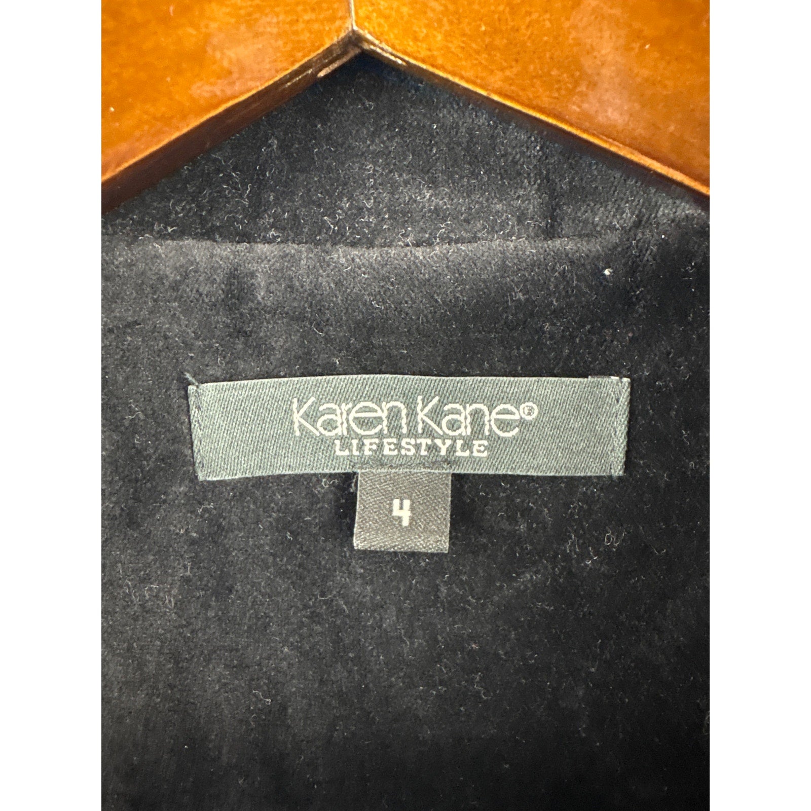 Elevate your holiday and special-occasion wardrobe with the Women’s Karen Kane Size 4 Black Velvet Blazer. Crafted from sumptuous black velvet, this blazer offers warmth and a polished silhouette for festive evenings and formal events. Distinctive details set it apart: two pockets each adorned with a bow and a bejeweled flower button that adds a subtle sparkle to your look. This is a true statement piece that blends classic tailoring with festive flair.