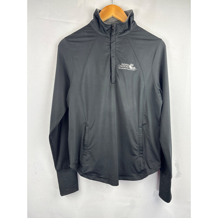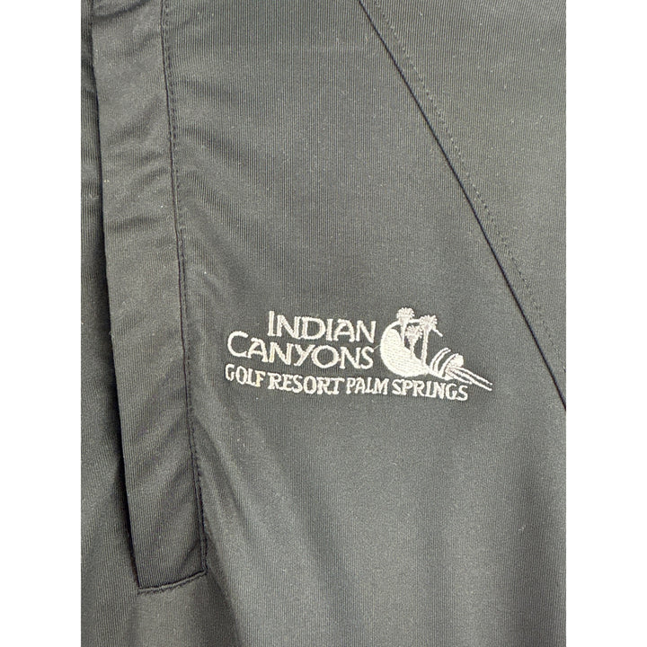 This pullover jacket offers a sleek design with its black finish, making it suitable for casual outings or sports activities. The embroidered Indian Canyons logo adds a touch of sophistication, while the medium size ensures a comfortable fit. Made from high-quality polyester and elastane, this jacket promises durability and style.